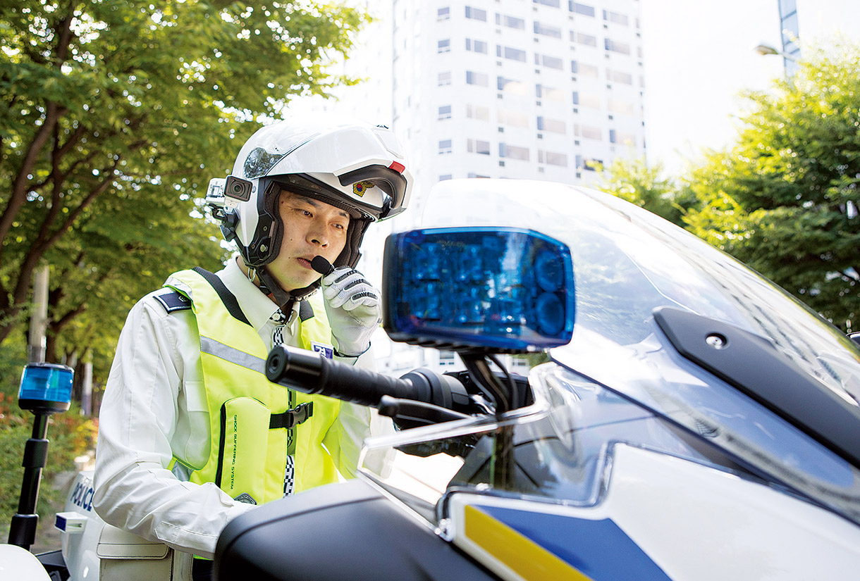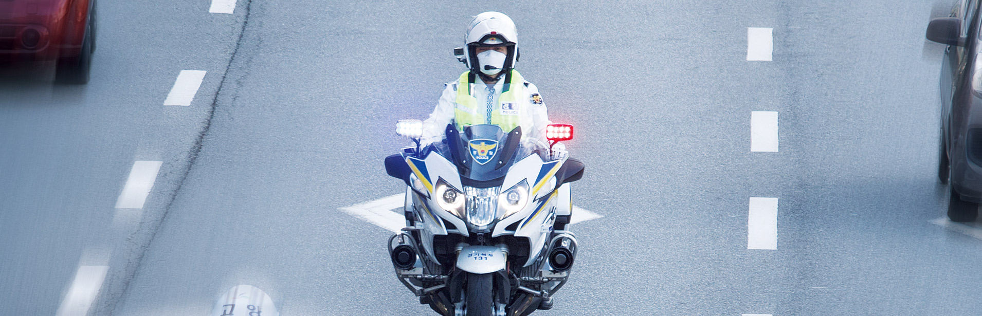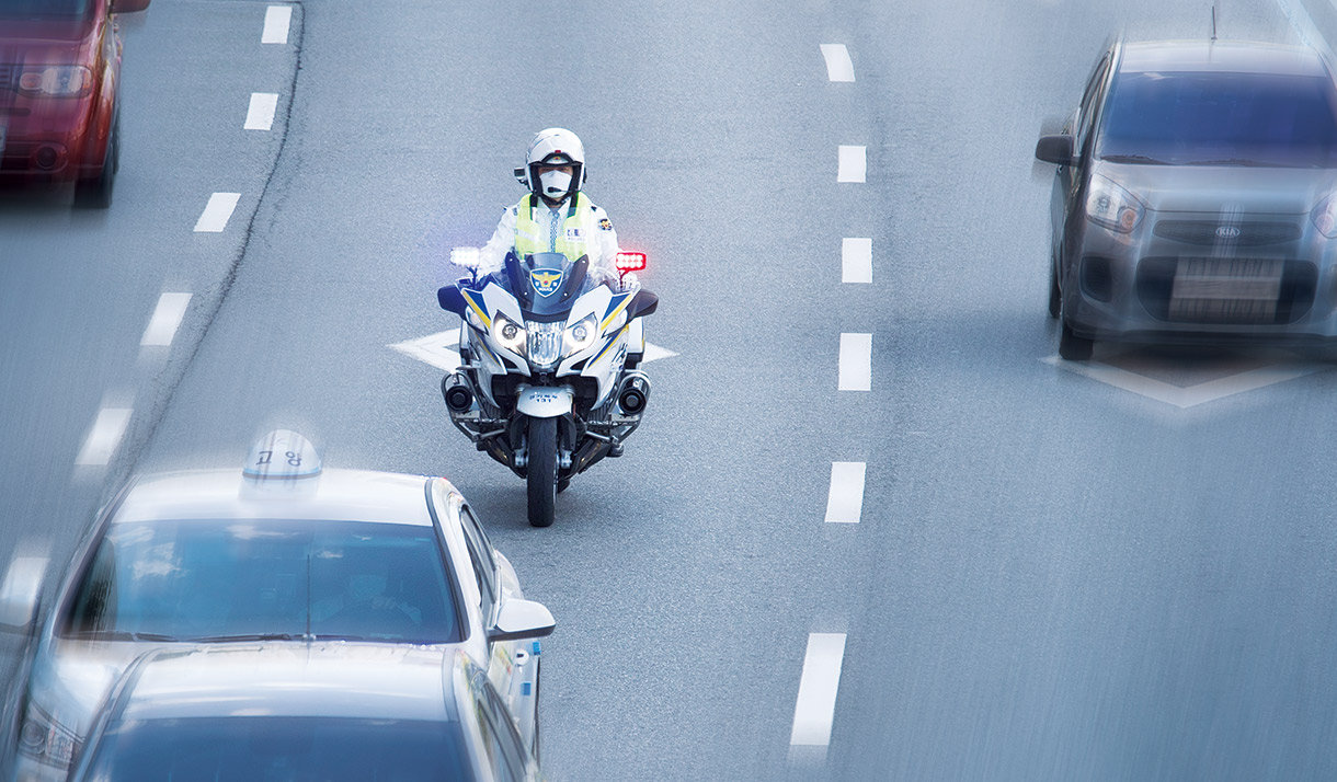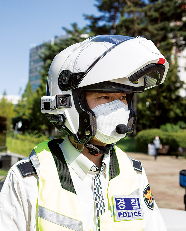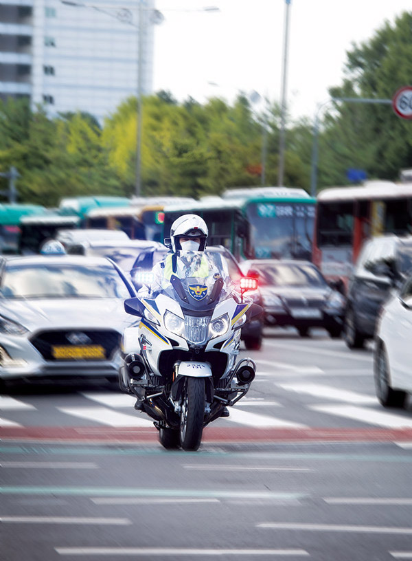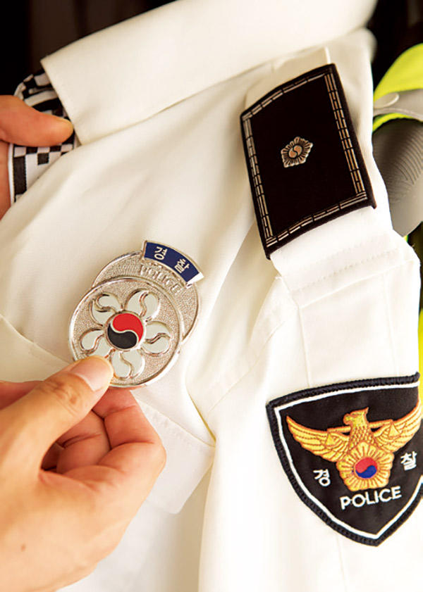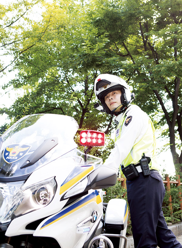 “출근시간이나 등교시간엔 교통정리를 하고, 이후 단속업무에 집중하고 있습니다. 오늘은 오후에 PM(개인형 이동장치)과 이륜차 단속에 집중하려고 합니다. 최근 이용자가 늘면서 안전사고도 많아지고 있거든요.” 도로가 붐비는 시간이면 어김없이 나타나 교통체증을 해소하고, 도로 안전을 살피는 것이 그의 일. 오늘도 그는 도로로 나갈 채비에 분주하다. 도로 위에서도 눈에 띄는 흰색 경찰복은 교통경찰의 상징. 그 위에 형광색 안전 조끼까지 입은 그가 옷 매무새를 정리하며 말한다.
