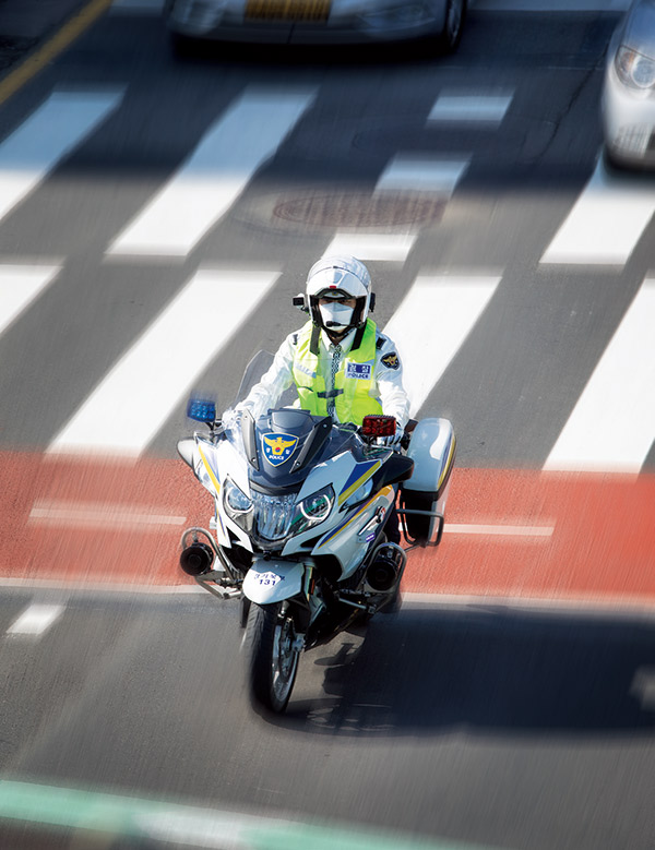 오후 6시. 모두가 하루일과를 마치는 시간. 문성준 경위는 다시 한 번 안전모를 고쳐 쓴다. 퇴근길 교통정리를 위해서다. 꽉 막힌 도로 상황 속에서도 교통경찰의 손짓 몇 번이면 묵은 체증이 내려가듯 도로에도 다시 생기가 돈다. “이럴 때 가장 뿌듯해요. 교통경찰이라는 직업의 매력이죠. 바로바로 결과가 눈에 보이니까요.”