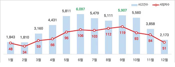 월별로 살펴보면 자전거 교통사고건수는 6월(6,097건)에 이어 9월(5,907건)에 많이 발생했다. 9월 자전거 교통사고는 전체 교통사고의 11.5%를 차지했으며, 특히 사망자 수가 119명으로 가장 많이 발생한 것으로 분석됐다.