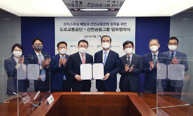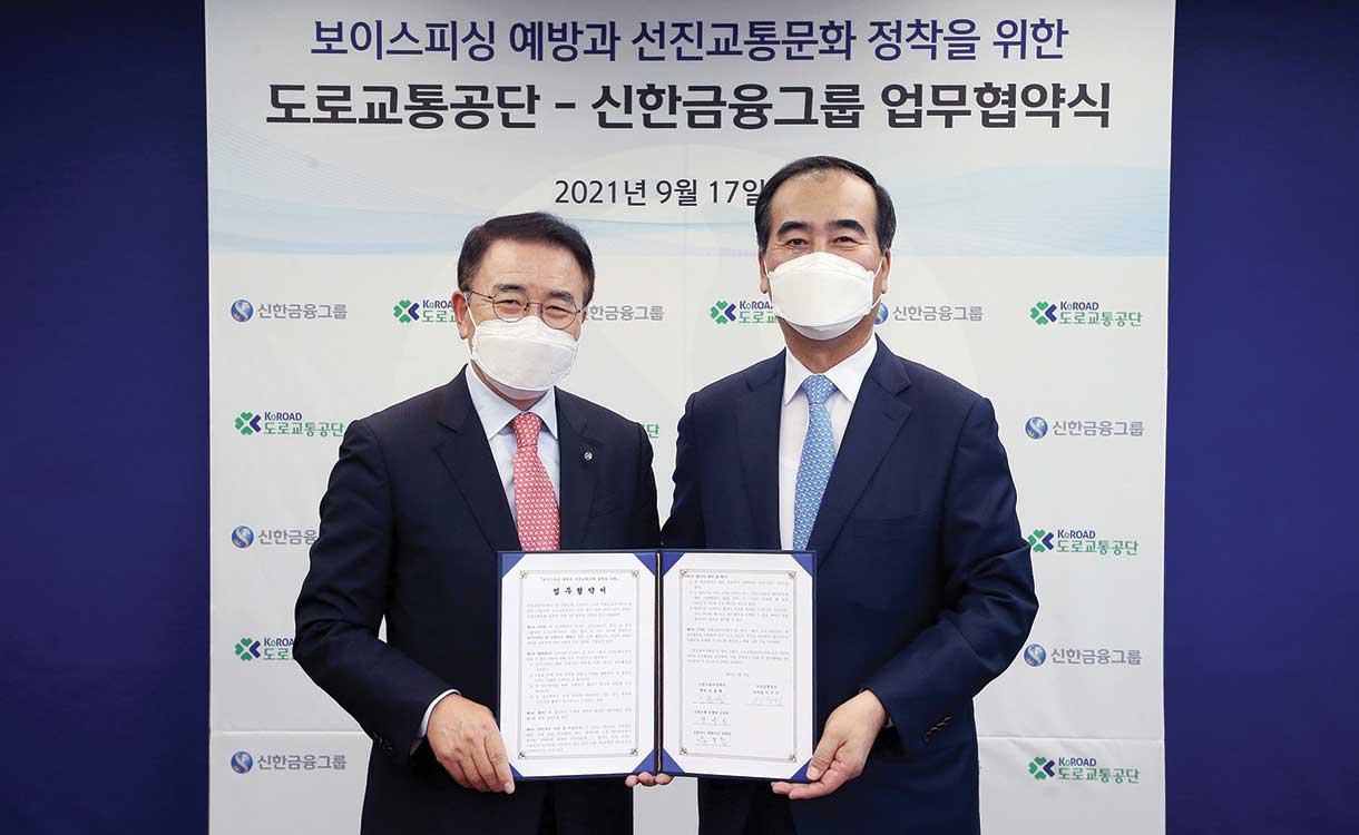도로교통공단은 신한금융그룹과 지난 9월 17일 신한금융그룹 본점에서 ‘보이스피싱 예방 및 선진교통문화 정착을 위한 업무협약’을 체결했다고 밝혔다. 양 기관은 이번 협약으로 전화금융사기 근절 및 교통사고 예방을 위한 대국민 홍보에 상호 협력하기로 약속했다.