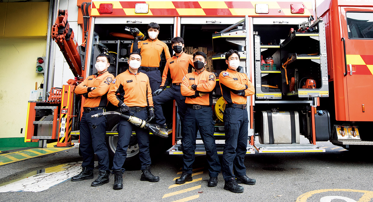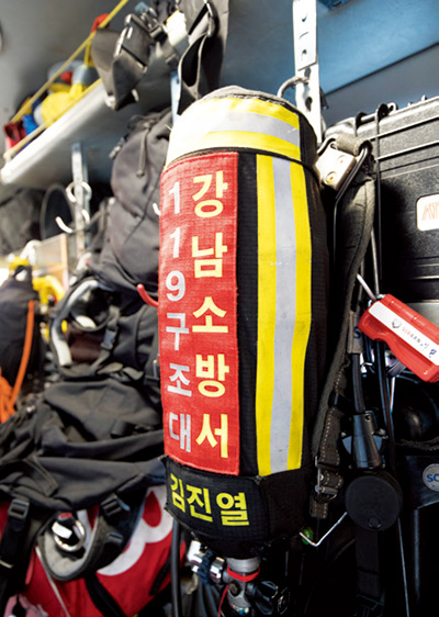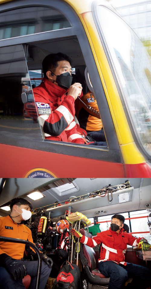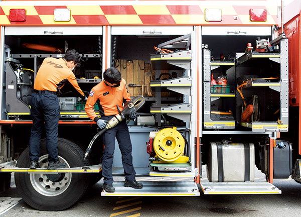“강남 지역의 특성상 외국인이 많아 구조가 필요한 출동 상황에서 급하게 의사소통을 해야 할 경우가 많습니다. 얼마 전 삼성역 사거리 에서 택시 교통사고가 났었는데요. 현장에 가 보니 외국인 한 분만 덩그러니 계셨습니다. 어떻게 된 상황인지 파악하기 위해 다가가 말을 걸었더니, 목격자라고 하시더라고요. 마침 직업도 간호사셔서 피해 상황에 대해 상세하게 전해 들을 수 있었습니다. 제가 영어를 공부하지 않았더라면 소통의 부재로 인해 구조가 늦어질 수 있는 상황이었죠.” 본격적인 업무는 8시 30분에 시작된다, 지난 밤 근무자 에게 인수인계를 받고 개인 장비를 체크한다. 공기호흡기, 무전기를 챙기고 공용장비와 구조장비, 유압장비 등 만일에 상황에 적재적소에 쓰일 장비들을 점검한다.