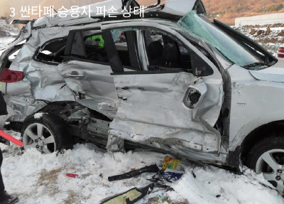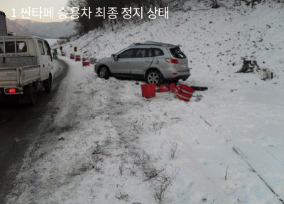 어느 겨울, 싼타페 승용차가 진행하다가 눈길에 미끄러지면서 중앙선을 침범하여, 맞은편에서 진행 중이던 화물차와 충돌한 대형교통사고가 발생하였다. 이 사고로 인해 싼타페 승용차의 탑승자 3명이 현장에서 사망하고 승용차 운전자와 화물차 운전자도 중상을 입는 인명피해가 발생했다. 사고가 난 도로는 국도확장공사로 인한 편도1차로로 된 우회구간으로 제한속도가 30km/h로 설정되어 있었으며, 사고지점 부근은 승용차 진행방향으로 우로 굽은 도로의 내리막 구간이 형성되어 있었다.