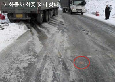 승용차는 주로 우측면부가 집중적으로 파손된 반면 화물차는 전면부가 파손되었다. 이러한 점으로 보아, 이번 사고는 승용차가 사고 전날 눈이 내려 아직 녹지 않은 우로 굽은 내리막 도로를 주행하다 미끄러져 중앙선을 넘어가 마주오던 화물차와 충돌한 것으로 추정된다. 눈길에서는 차량이 운전자 의도와 달리 쉽게 미끄러져 차체가 균형을 잃고 중앙선을 넘어가거나 도로를 이탈하는 경우가 흔히 발생한다. 이처럼 눈길이나 빙판길에서 중앙선침범 사고를 예방하기 위해서는 앞차와의 안전거리를 확보하는 것도 중요하지만 맞은편에서 차량이 다가오면 차가 자신의 의도와 다른 방향으로 미끄러지지 않도록 충분히 속도를 줄여 주행하는 것이 무엇보다도 중요하다.