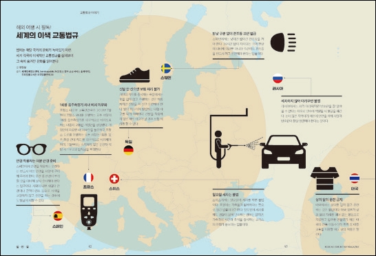 ‘세계의 이색 교통법규’ 기사가 가장 유익했어요. 다른 나라의 교통법규를 잘 몰랐는데, 예를 들어 프랑스에서는 일회용 음주측정기 차내 비치 의무, 스페인은 여분의 안경 반드시 차량에 비치 등인데, 언젠가 유럽에서 운전할 때 큰 도움이 되는 상식입니다.^^