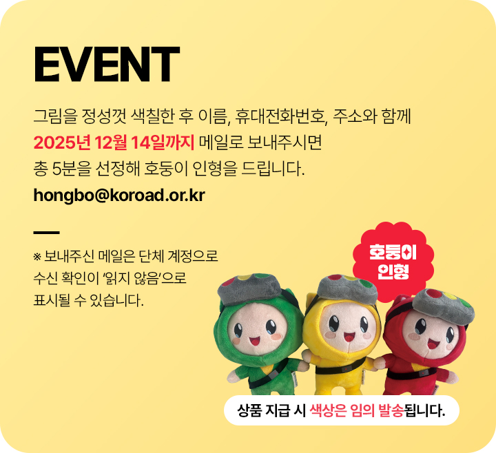 한국도로교통공단 마스코트 호둥이는 교통안전 메신저입니다. 호둥이를 예쁘게 색칠하면서 안전한 도로교통 생활을 약속해 봅시다. 내려받기 지난 호 당첨자 양*희(95*7) 윤*근(02*4) 정*철(07*2) 장*동(75*6) 김*태(38*1) 교통안전 소식 호둥이 색칠공부 독자 마당